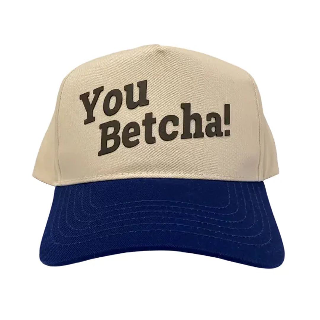 Royal blue and natural trucker hat featuring “You Betcha!” In grey leatherette.